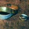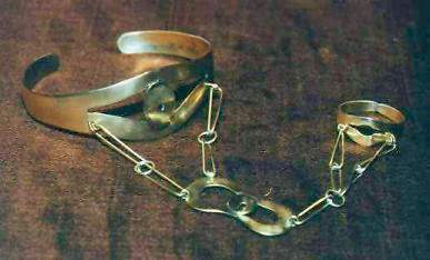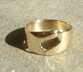 I made this for her birthday. It should be like 2 hands that interlace. Goldplated but it always rubbed of. She liked it a lot but couldn't wear it because the brass went blue on her finger and after several tries to coat it with gold, even at a jewelers, her finger always went blue again after a few days. Even special laquers and nail polish only helped a few days at best.