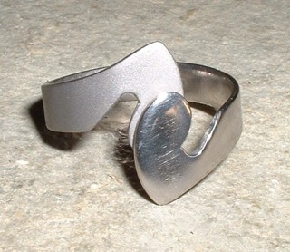 Since her mom took the other one she could get another. It is very similar to this prototype, also out of aluminum. The idea was to make a pretty ring that closes without soldering. And somehow I like puzzles. I still have the prototype at home.