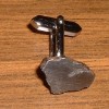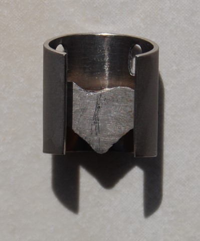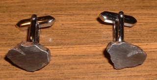 Cufflinks made of meteorite slices. I used the meteorite I bought once in a whole. ( you can see it further up, a fragment of the Sikhote Alin meteorite). Too bad it was so small, there is no structure visible after etching. The mechanism is from some other cufflinks I cut up. I left the crust, as you can see there is also some other inclusions in the metal, like a hole filled with some other metal. I gave these to my cousine Anne for as a present for her Husband.