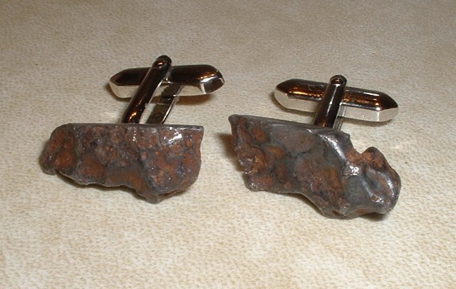 These are my cufflinks made of meteorite crust. From the same meteorite I bought once in a whole. ( you can see it further up, a fragment of the Sikhote Alin meteorite). Too bad there is no structure visible after etching. But you can see a lot of crust.