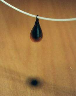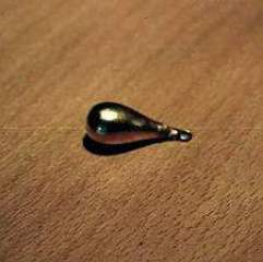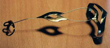 This was a test again, I just wanted to make a gold drop the way I imagined it in the book. It was not planned for anybody, but when I showed it to Yalda, she liked it so much I gave it to her, because it seemed to fit, it suited her style I guess. It is made out of wood, with a nail in the middle so I could turn the shape and also so I could solder a loop on it to attach it. Then it was coated with a conducting paint, and electroplated with copper and then 24 carat gold. I hope it didn't wear off.