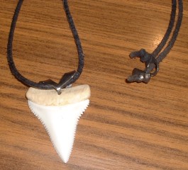 This is a real tooth of a Great White shark found in Florida. They can be found while diving since sharks loose their teeth when eating. I bought this one though and it is over 1 inch long. I made the other parts of Titanium. The closing system is very simple yet effective, with leather band.