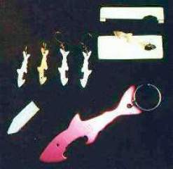 I really got started making jewelry with these little sharkys out of aluminum and brass. They are a miniature copy of the big red key holder I found in a flower shop once, I thought it was cool so I made them in small. I made about 26 or so of them and handed them out to my female friends. The key holder also works as a bottle opener even though it wasn't designed to do so. I should still have one or another. I tried many different materials, brass, aluminum, some gold plated, some silver plated.
